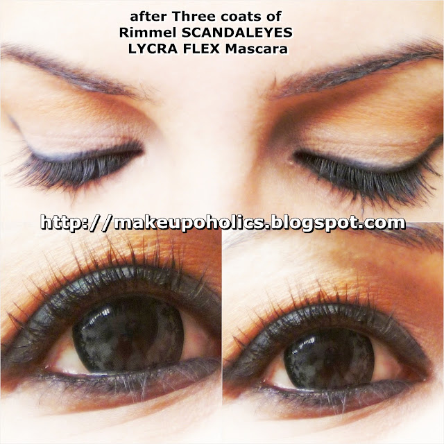 My eyes are not big but have reasonable lashes . I always expect my mascara to not only lengthen my lashes but give them a more fuller look for the maximum hours. And as shown in the above pictures , SCANDALEYES LYCRA® FLEX MASCARA from RIMMEL LONDON not only lengthen my lashes but truly give them a more fuller look . It also fulfills the promise of giving outrageously lush lashes that never feel stiff or brittle for the whole day . The mascara stayed perfectly for all day on my lashes without giving any stiffness to my lashes .